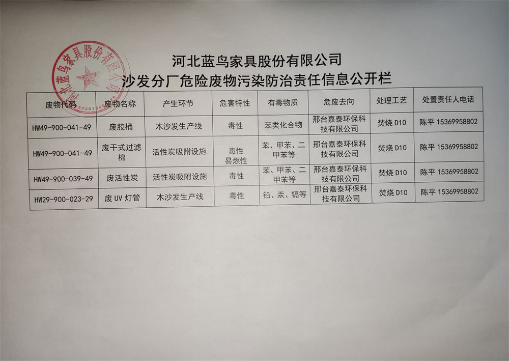 河北蓝岛家具股份有限公司沙发分厂危险废物污染防治责任信息公开栏