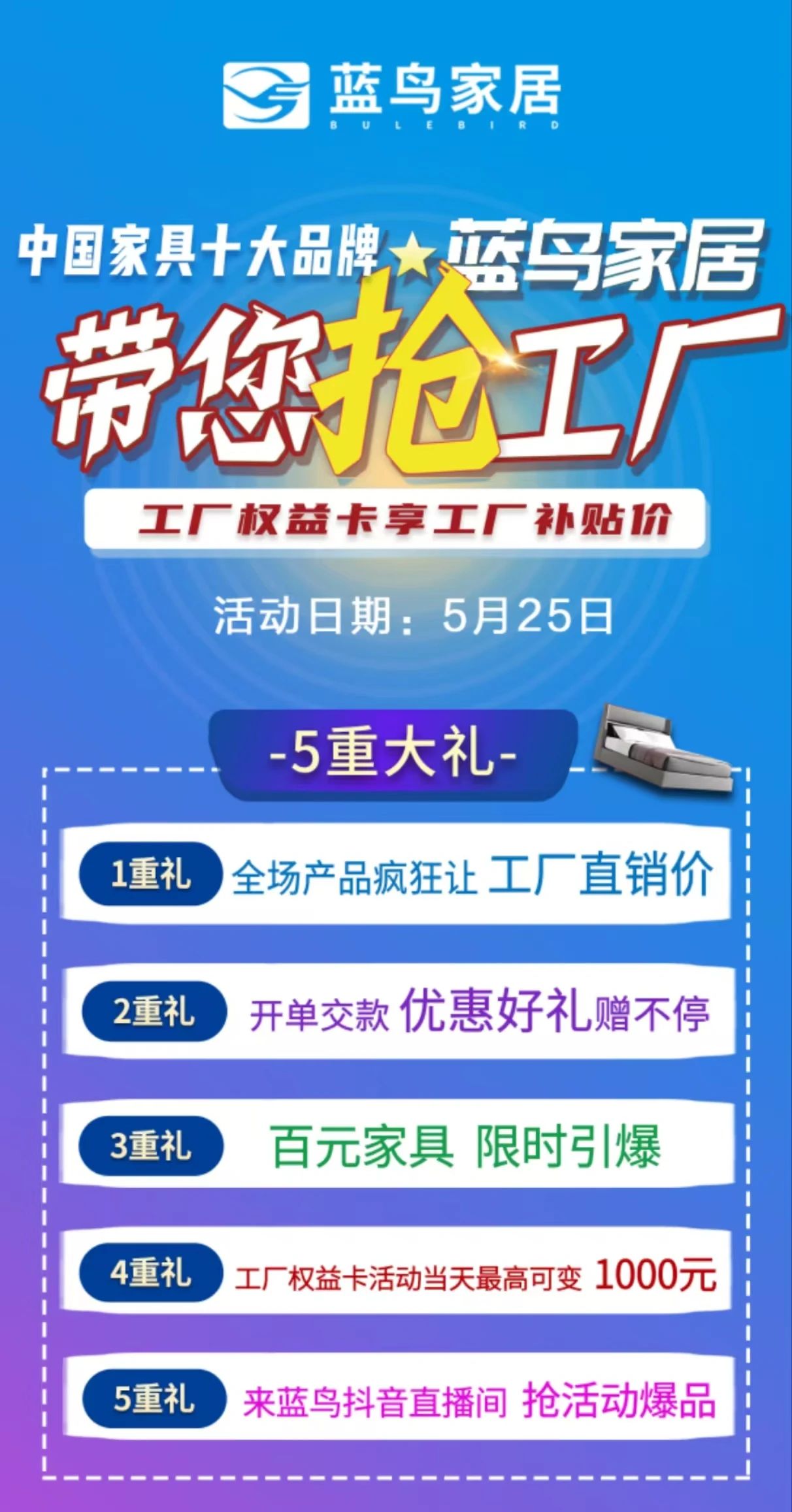 蓝鸟家居5月25日推出工厂权益卡,在此期间9.9元抢占名额,可参加抢工厂活动。享受工厂直销价,爆品限时抢,满减活动等5大权益等您来!详情请到附近蓝鸟门店咨询